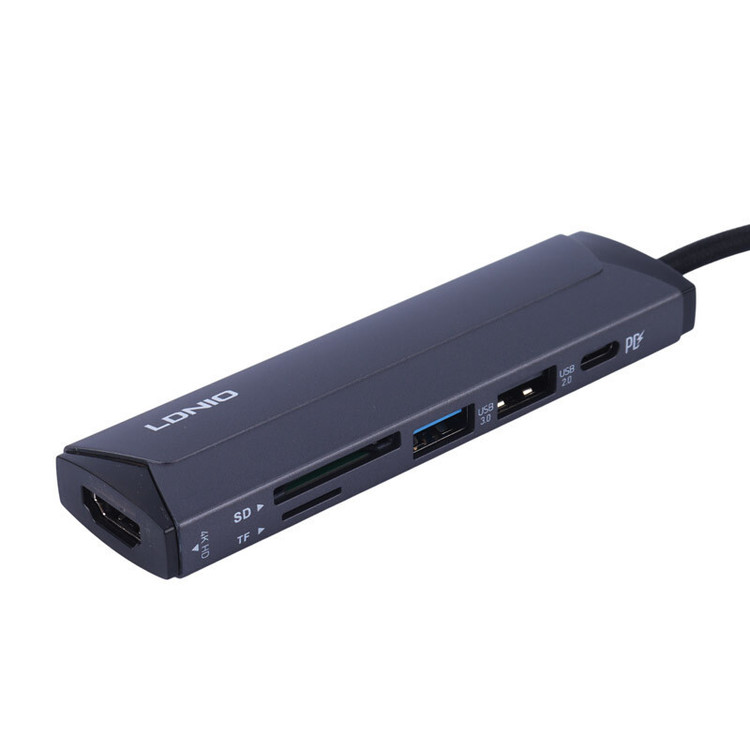 هاب ها یکی از کاربردیترین لوازم جانبی کامپیوتر و لپ تاپ محسوب میشوند. این گجتها میتوانند پورتهایی که روی لپ تاپ شما وجود ندارد یا اشغال هستند را به آن اضافه کرده و کارتان را سادهتر کنند. مثلا حتما پیش آمده که دو درگاه USB روی سیستم با موس و هارد اشغال شده باشند و جا برای اتصال هیچ کابل USB دیگری نداشته باشید. هاب 6 پورت الدینیو LDNIO DS-56H توان 100 وات یکی از هابهای باکیفیت است که میتواند در چنین مواقعی به کمک شما بیاید. شرکت الدینیو/LDNIO در این هاب چند کاره خود پورتهای متنوعی تعبیه کرده استدرگاههای روی بدنه هاب الدینیو DS-56H شامل 2 درگاه USB، یک درگاه Type-c، یک درگاه HDMI، دو درگاه رم ریدر است. وجود IC Smart بر روی بورد این هاب باعث میشود که استفاده از چند پورت در کنار هم موجب فشار به هاب و خراب شدن آن نمیشود.2 درگاه یو اس بی روی هاب 6 پورت LDNIO DS-56H قرار داده شده که یکی از آن از نوع USB3.0 و یکی از آنها از نوع USB3.2 است. به کمک این درگاهها میتوانید موس، کیبورد، فلش و یا هارد درایوهایتان را به لپ تاپ وصل کنید. از آنجایی که هاردها مصرف برق بالایی دارند شاید بهتر باشد هنگام وصل کردن آن لپ تاپ را هم به شارژ بزنید. درگاه USB3.0 میتواند با سرعت حداکثر 5 گیگابیت بر ثانیه/600مگابایت بر ثانیه اطلاعات را انتقال دهد. سرعت انتقال اطلاعات به کمک درگاههای USB2.0 نیز به 480 مگابیت بر ثانیه/60 مگابایت بر ثانیه میرسد.امروزه انتقال تصاویر با کیفیت چه در هنگام فیلم دیدن، چه بازی کردن و چه ارائه در یک جلسه کاری اهمیت بسیار زیادی پیدا کرده است. بر روی هاب 6 پورت LDNIO DS-56H نیز یک درگاه HDMI قرار گرفته که قابلیت انتقال تصاویر را دارد. در نتیجه شما میتوانید از لپ تاپ خود تصاویر را به یک نمایشگر یا ویدئوپروژکتور یا موارد مشابه منتقل کنید. کیفیت تصاویر انتقالی از این درگاه HDMI برابر با رزولوشن 4K است.