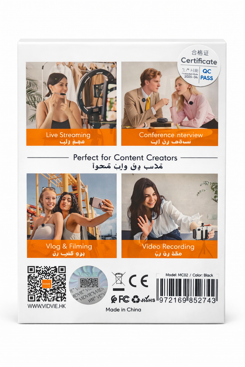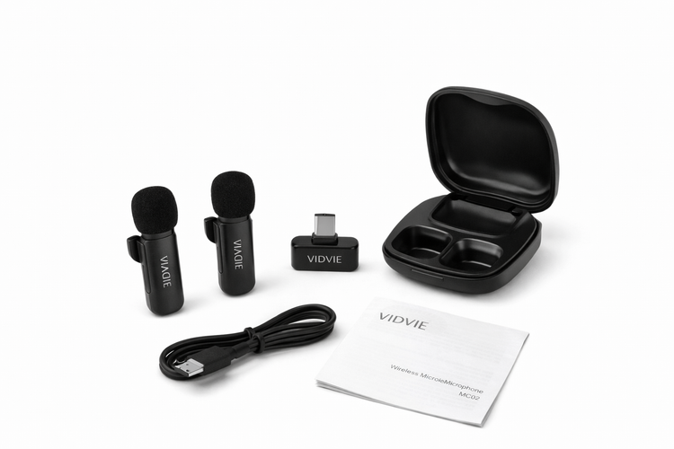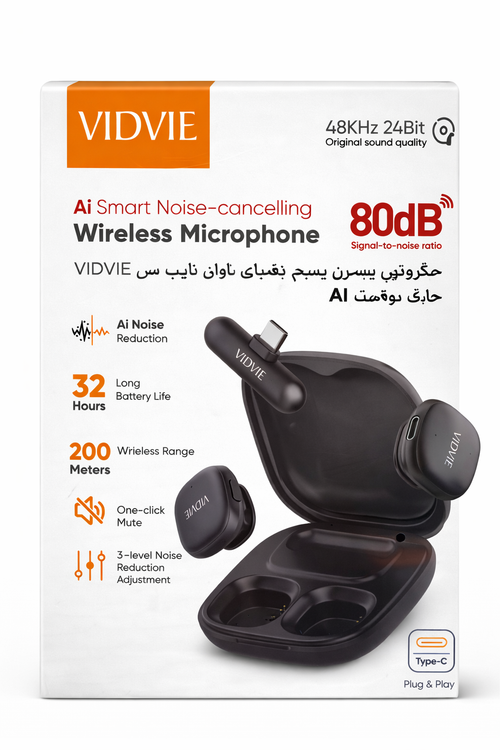 میکروفون بیسیم VIDVIE یک گزینه حرفهای برای تولید محتوا، ضبط ویدئو، مصاحبه، آموزش آنلاین و بلاگری است که با بهرهگیری از فناوری حذف نویز هوشمند AI صدایی شفاف و بدون نویز محیط ارائه میدهد. این میکروفون با طراحی کاملاً بیسیم و اتصال Plug & Play از طریق درگاه Type-C، بدون نیاز به نصب نرمافزار به سرعت آماده استفاده میشود.